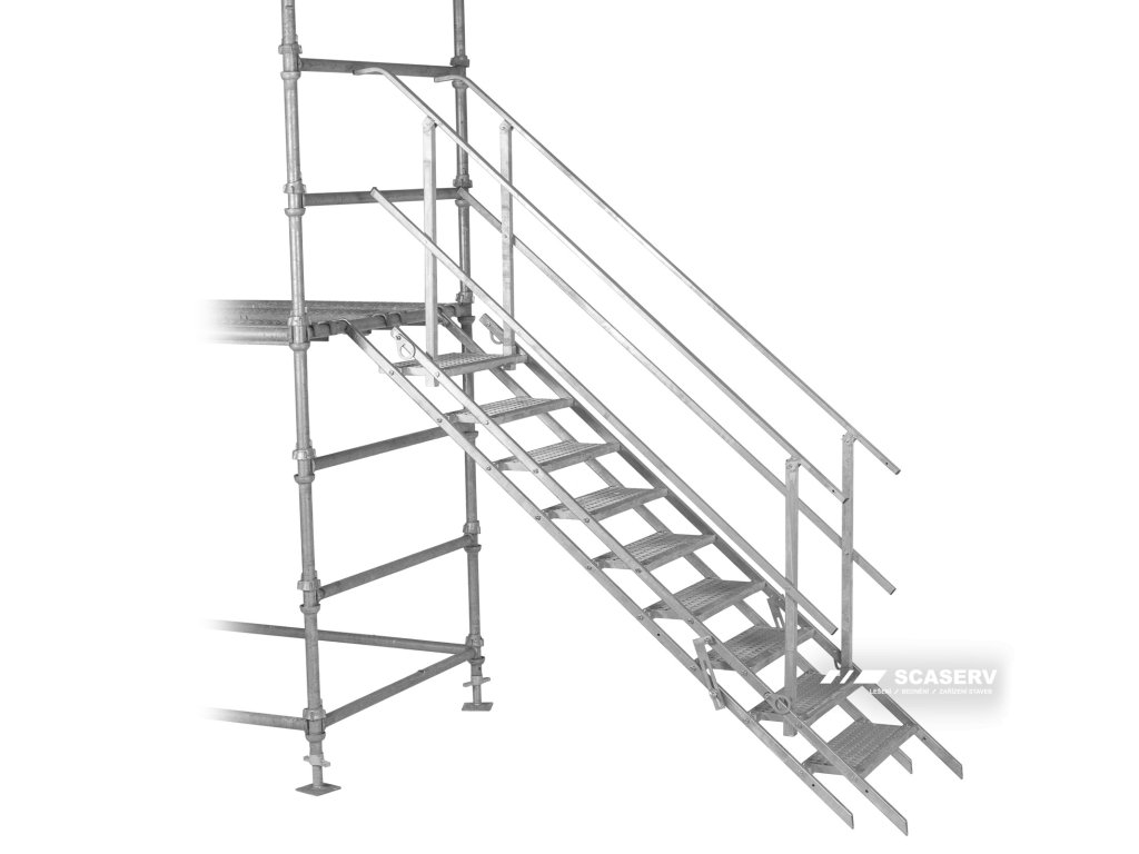Jednotlivé schodišťové stupně mají protiskluzovou úpravu, celé schodiště je z pozinkované oceli, což zajišťuje dlouhodobou živostnost a odolnost vůči poškození.
